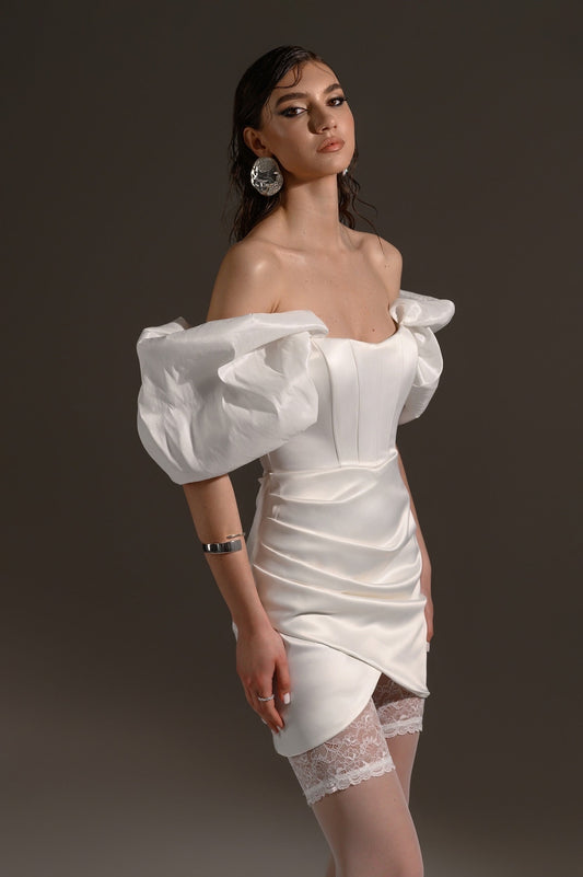 Rochie scurta alba cu maneci bufante