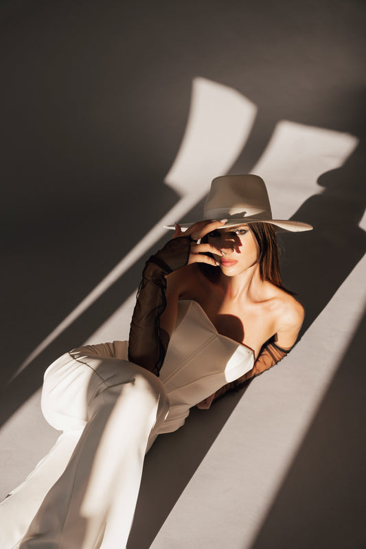 Costum alb cu corset și pantalon evazat